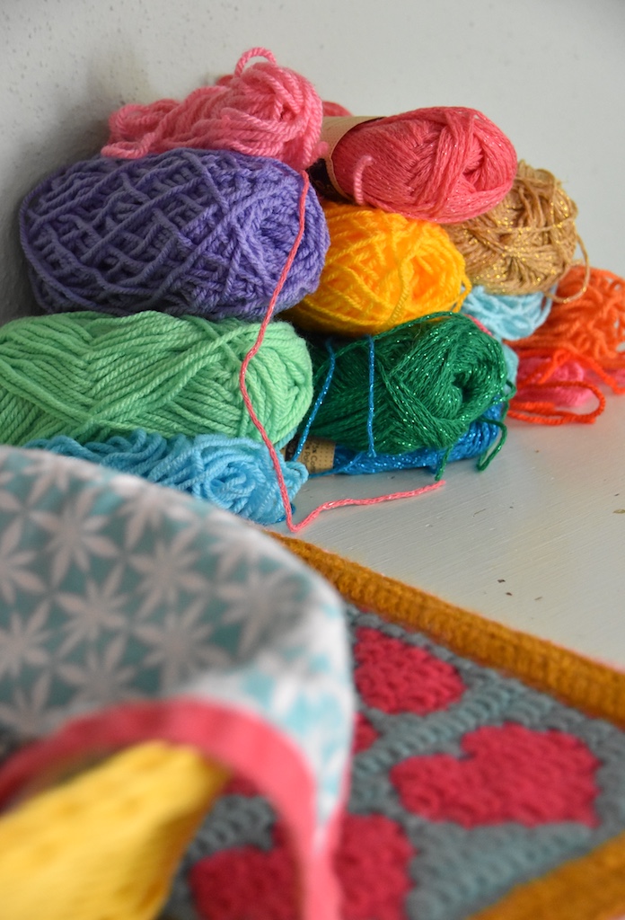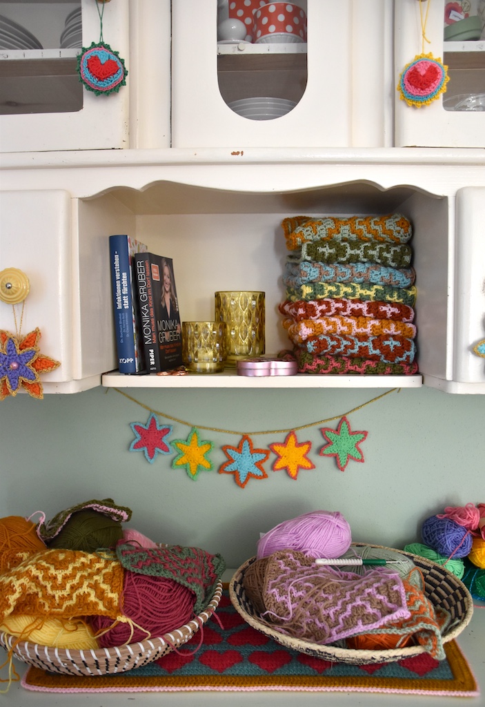 In der Küche hat sich eine Hobbytheke etabliert. Bestückt mit Wolle und Fabriziertem – wunderbar.