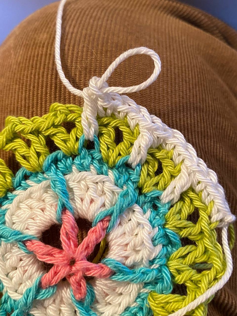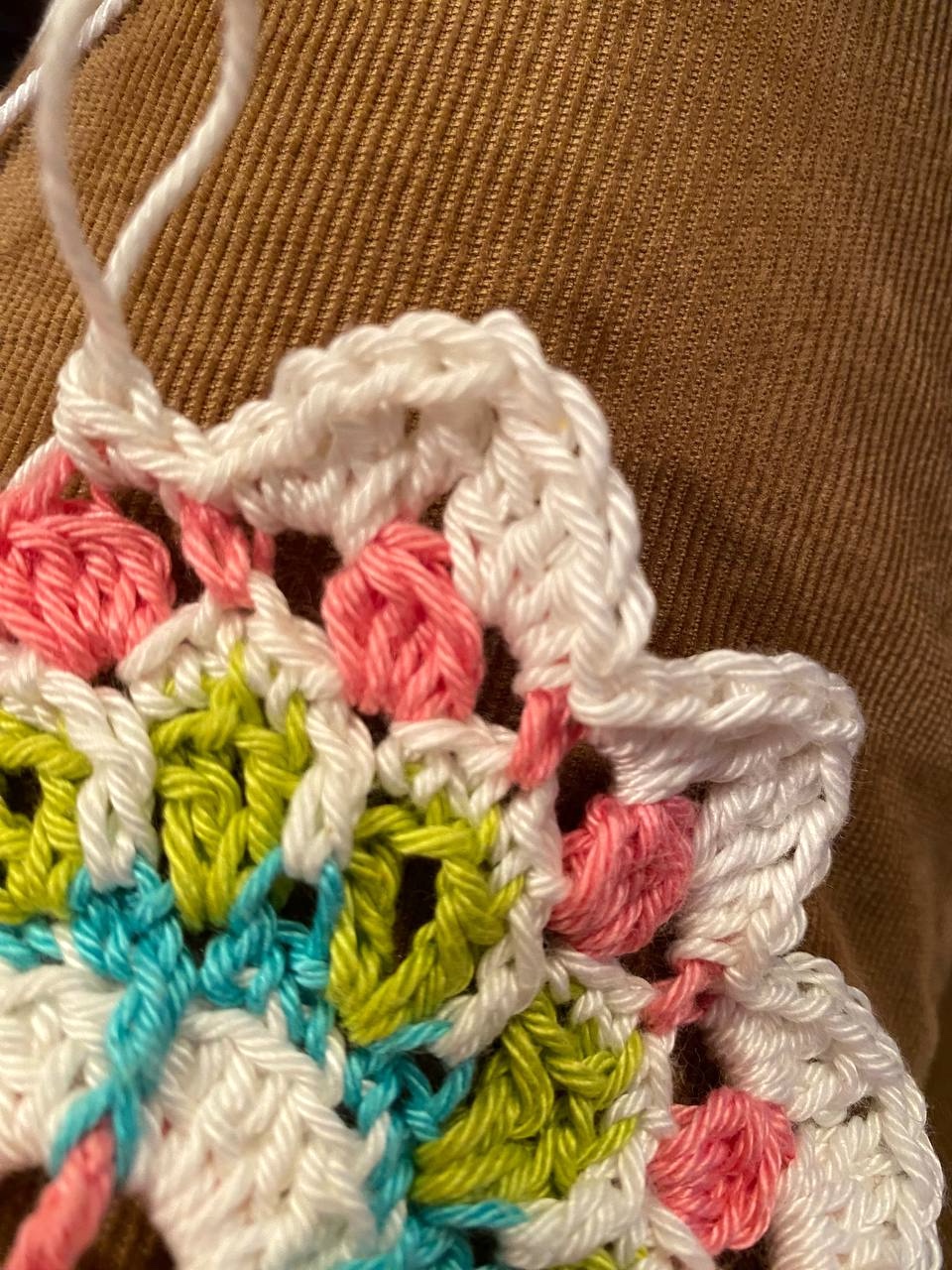 5. Runde weiß: 1 tiefergestochenes Stäbchen in die minte Vor-Vorrunde, zwischen die Stäbchen-Luftmaschen-Stäbchen-Gruppe. Hier lohnt ein Blick auf die Fotos ;). 3 feste Maschen auf den Luftmaschenbogen der Vorrunde…