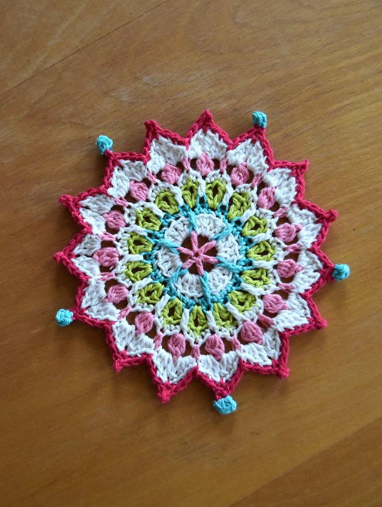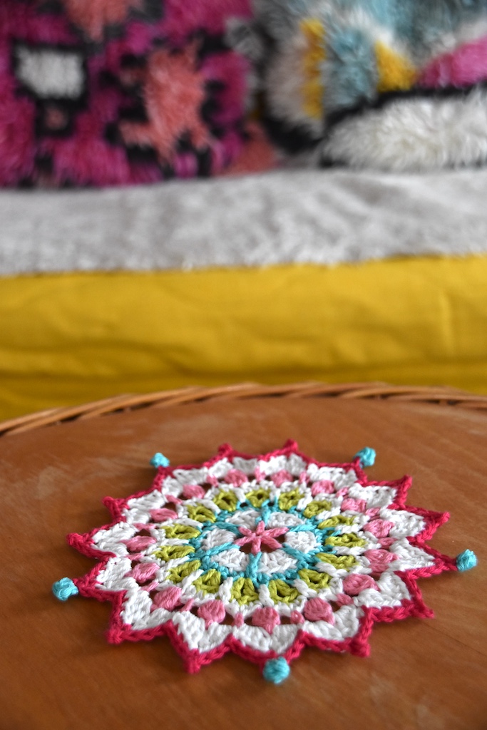 7. Runde weiß: 1 Kettmasche auf die feste Masche der Vorrunde. In den folgenden Luftmaschenbogen: 1 feste Masche, 1 halbes Stäbchen, 1 Stäbchen, 1 Doppelstäbchen und noch 1 Luftmasche. Dann in den nächsten Luftmaschenbogen: 1 Doppelstäbchen, 1 Stäbchen, 1 halbes Stäbchen, 1 feste Masche. In die feste Masche der Vorrunde 1 Kettmasche… Soooo. Ihr könntet auch das halbe Stäbchen weglassen, wenn es euch zu kompakt erscheint. Ich hab das fertige Deckchen angefeuchtet und gespannt, dann lag es schön glatt. Probiert es aus.
