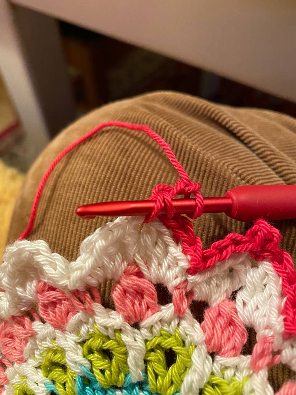 8. Runde rot: 1 Kettmasche auf die Kettmasche der Vorrunde. Seitlich drei feste Maschen häkeln, dabei nur in das hintere Maschenglied einstechen. 1 feste Masche in die Lücke zwischen den Doppelstäbchen und noch 2 Luftmaschen und 1 Kettmasche in den unteren Teil der festen Masche – siehe Foto. Das ist dann sowas wie ein Pikot. Dann wieder 3 feste Maschen seitlich runter und 1 Kettmasche….