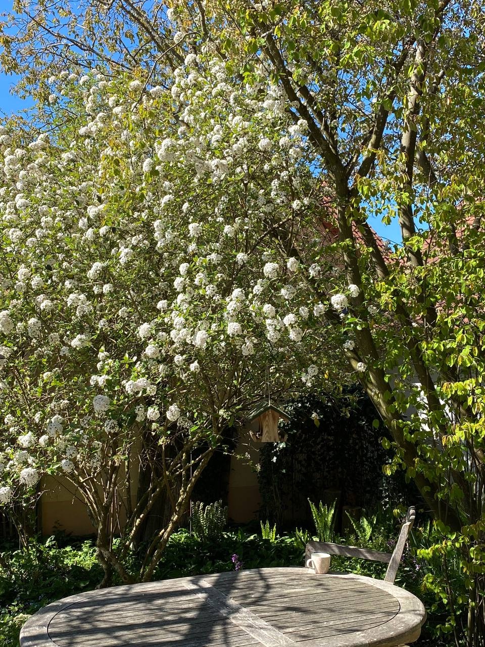 …im Garten sitzend, mit einer Tasse Kaffee. Unter dem üppig blühenden und wunderbar duftenden Schneeball raubt es mir fast die Sinne. Deswegen wahrscheinlich die Überschrift 😉