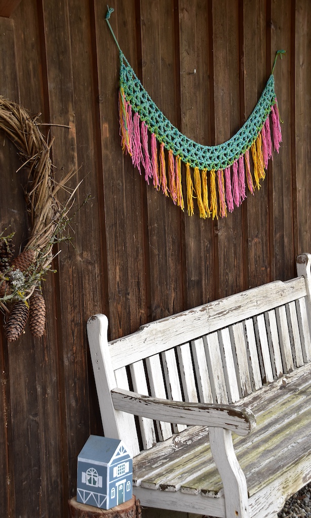 So. Nun einen Wollfaden als Aufhänger anbringen und mit Heißkleber, oder einer Nähnadel die Luftmaschenketten befestigen. Nur oben an der Spitze leicht fixieren, das reicht.