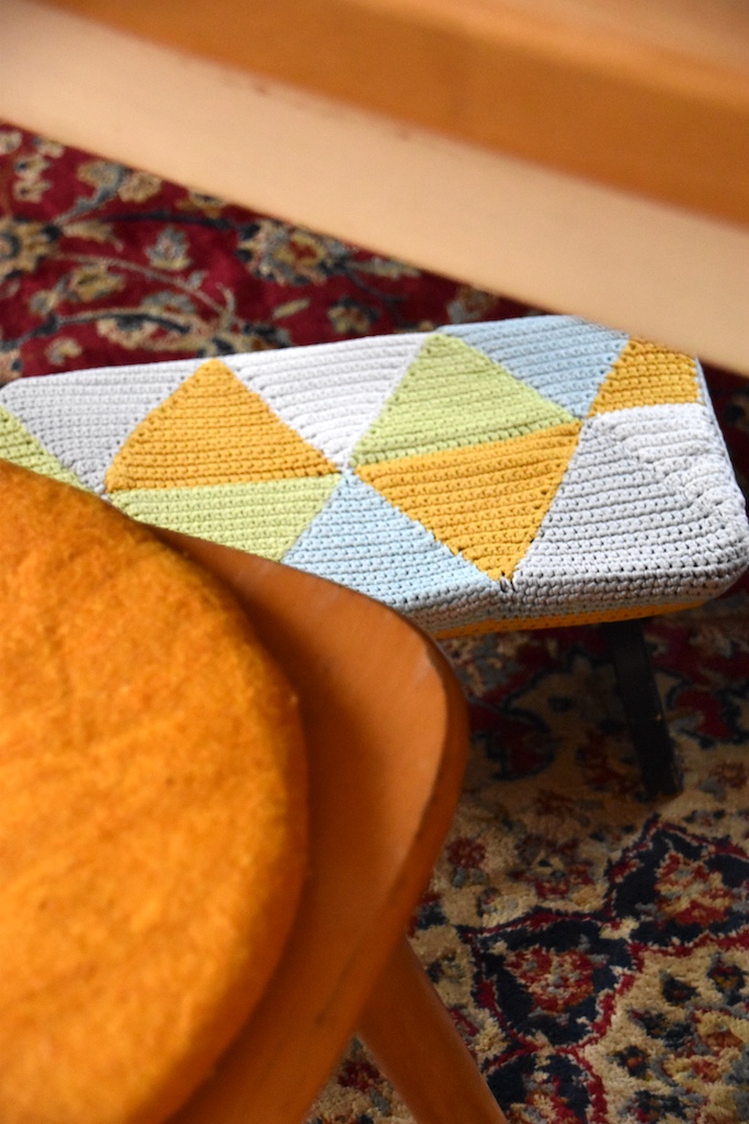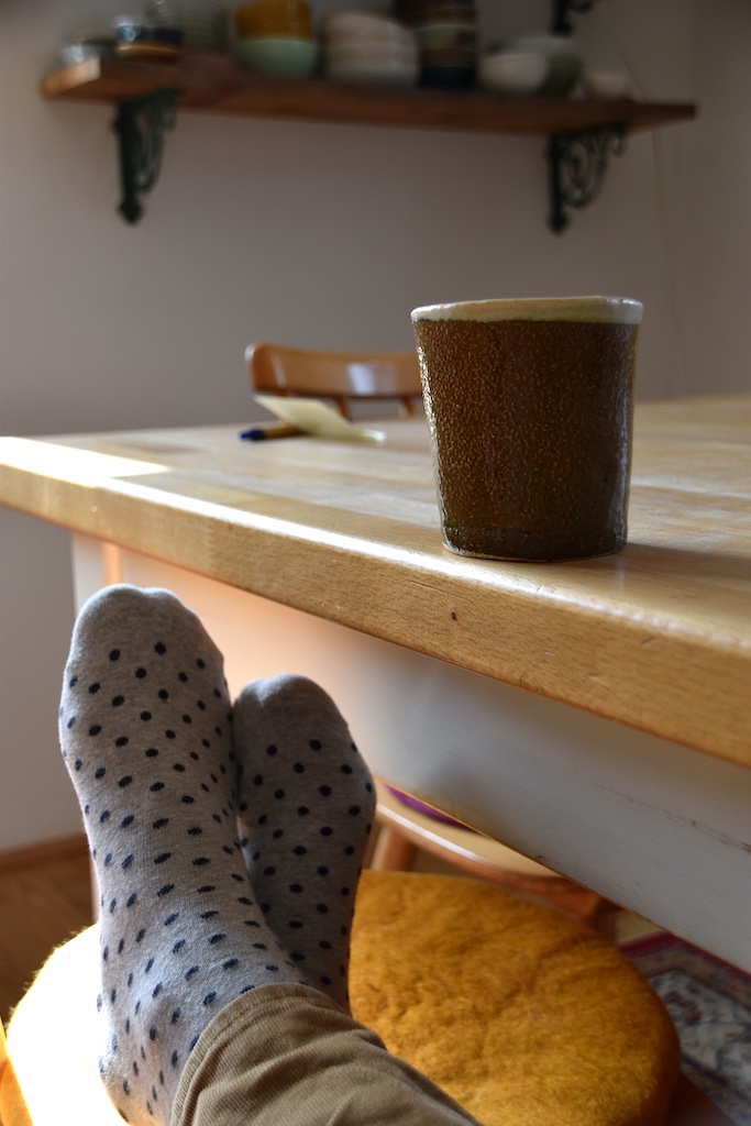 Ohhh, ich guck grad aus dem Fenster, unseren aufgeschichteten Brennholzstapel im Blick. Was seh ich da, neben vielen Spatzen – eine Maus spaziert darin herum. Sieht süß aus, obwohl ich vor den kleinen Tierchen schreiend weglaufe. Und sagt man nicht wo eine Maus zu sehen ist, sind hundert davon im Hintergrund – oder so. Egal, ein kurzweiliger netter Moment. Manchmal brauche ich etwas mehr Sauberkeit im Haus. Das hält ein paar Tage an, in denen ich vermehrt putze. Dann ist es wieder gut für ein paar Wochen. Ohne Lesebrille, ohne den genauen Blick, lebt es sich ganz entspannt. So hab ich den kleinen Schemel-Bezug nach dessen Reinigung wieder aufgezogen. Das muss eines meiner Anfangsprojekte gewesen sein. Jahrelang steht er unter dem Küchentisch und bietet eine gute Ablage für die Füße, wenn man sich in den Stuhl reinlümmeln mag, halb liegend, nach einem guten Mahl oder mit einer Kaffeetasse. Grad jetzt nutze ich ihn auch. Mit Staubsaugergetöse und dem Plattenspieler auf Lautstärkenanschlag drehte ich meine Runden im Haus. Radio hör ich seit 5 Jahren nicht mehr. Heute schätze ich den Plattenspieler wieder. Und dank meiner ältesten Freundin, deren musikalischer Fundus zu mir gewechselt ist, drehte sich heute die Stefanie Werger (zügellos und frei) auf dem Teller. Zum Vormittagskaffee leg ich mir den Tom Waits auf. „Martha“ – ein Lied welches mich nach vielen Jahren immer noch berührt. Also – ich brüh mir jetzt ein Haferl auf…