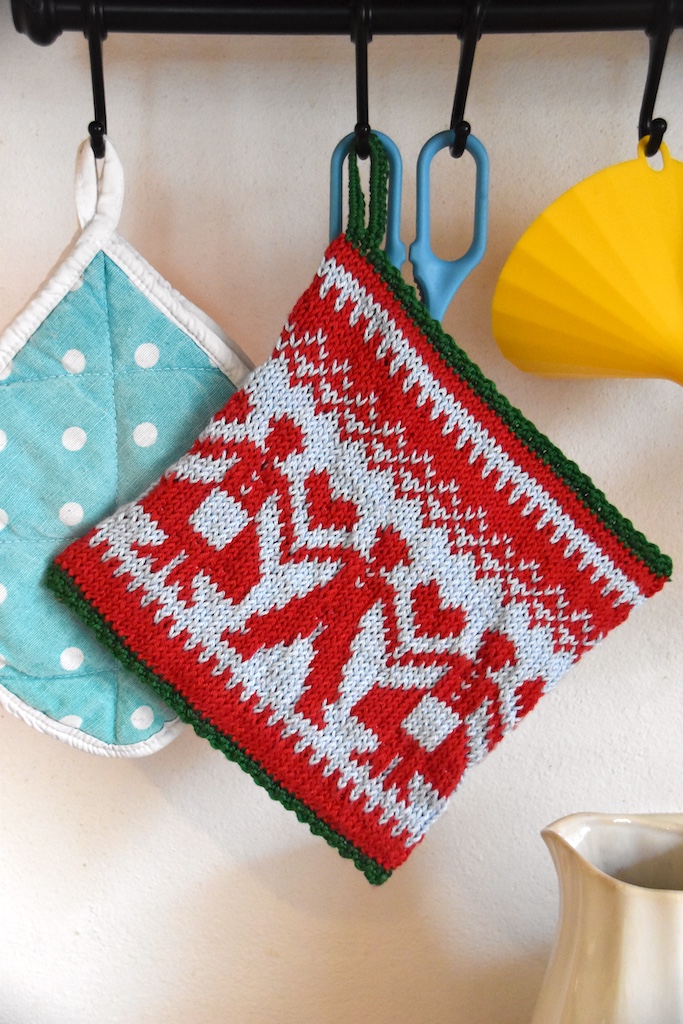 Topflappeneckdaten: Mit Baumwollgarn und einer Rundstricknadel nen mustrigen Schlauch gestrickt. Ist ca. 20 x 20 cm groß, die seitlichen Öffnungen zusammengehäkelt. Vorteile von dieser Strickausführung: Hält die Hitze gut ab – ist ja doppelwandig. Angenehm weich. Häkellappen mit festen Maschen sind starrer. Mein Lappen wird beim Waschen etwas schrumpfen, hat dann aber immer noch ne handliche Größe. Es gefällt mir mustertechnisch sehr gut und es sind noch fünf Millionen andere Varianten möglich. Ein weites Feld…. Ein ästhetischer, funktionaler Küchenhelfer. So. Nun genug gelobhudelt 🙂